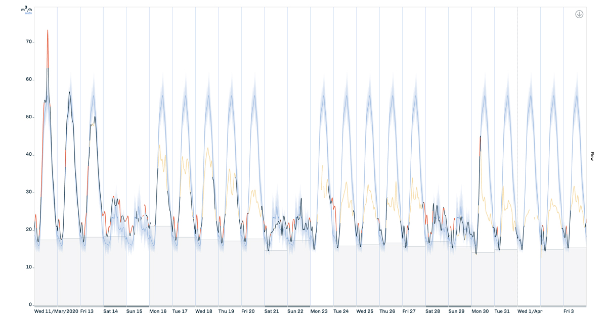 The chart illustrates the sharp drop introduced immediately after a lockdown mandate goes into effect (blue shaded is the predicted value, black/yellow the monitored value). Running detectors on water quality levels, and not just flows or pressures, has been instrumental in highlighting the magnitude of the behavioral changes and assisting the operational team in reinventing network management to stay abreast of issues.