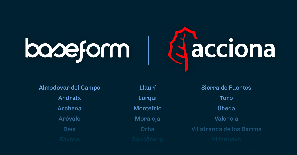 ACCIONA, a global leader in water management, with a very complete vision for how data and digital systems can be leveraged to advance all aspects of the water cycle in human communities, has selected Baseform’s enterprise solution for implementation in all services of the integral water cycle managed by ACCIONA in Spain. This includes the management of drinking water and wastewater systems, following up on a successful progressive implementation across several of ACCIONA’s water systems. The move marks one more key milestone for Baseform, in pursuit of our ultimate goal of contributing to water management excellence in the widest possible number of cities worldwide. We are grateful to ACCIONA for their trust in our product and their wide-ranging technology strategy vision, and we look forward to working and learning together.